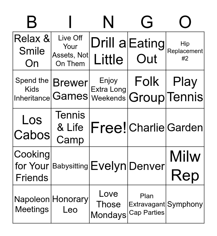 This bingo card has a free space and 24 words: Babysitting, Honorary Leo, Enjoy Extra Long Weekends, Napoleon Meetings, Hip Replacement #2, Relax & Smile On, Spend the Kids Inheritance, Live Off Your Assets, Not On Them, Charlie, Evelyn, Folk Group, Los Cabos, Denver, Milw Rep, Brewer Games, Plan Extravagant Cap Parties, Garden, Drill a Little, Play Tennis, Tennis & Life Camp, Symphony, Cooking for Your Friends, Eating Out and Love Those Mondays.
