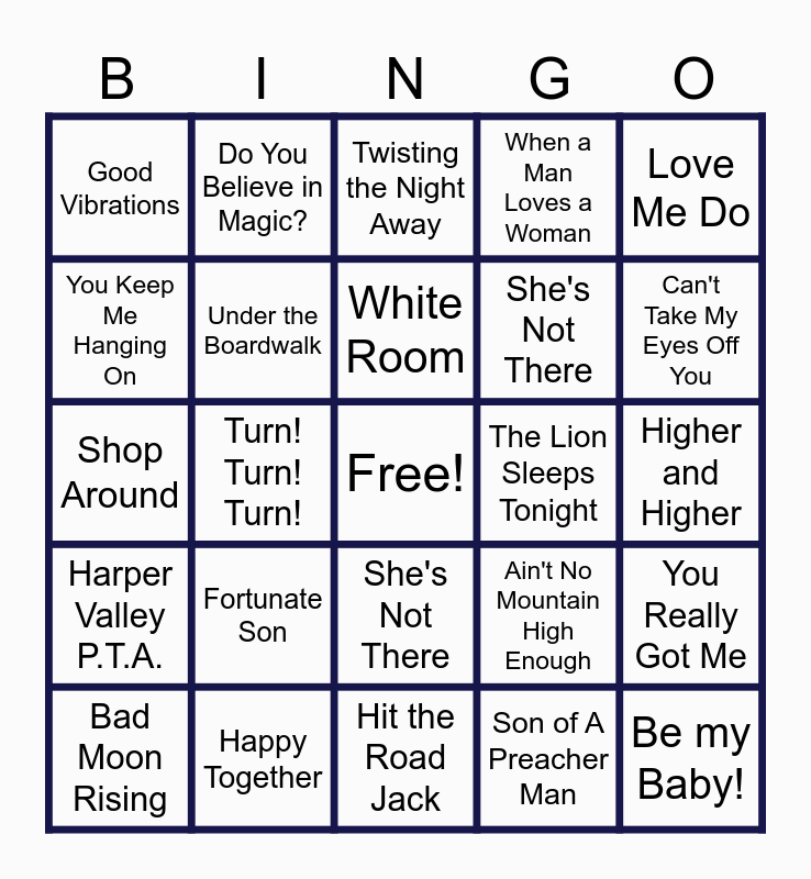 This bingo card has a free space and 24 words: Fortunate Son, Happy Together, White Room, Bad Moon Rising, Love Me Do, Good Vibrations, You Keep Me Hanging On, Do You Believe in Magic?, The Lion Sleeps Tonight, She's Not There, She's Not There, Shop Around, Ain't No Mountain High Enough, You Really Got Me, Under the Boardwalk, Son of A Preacher Man, Higher and Higher, Twisting the Night Away, Can't Take My Eyes Off You, Turn! Turn! Turn!, Be my Baby!, Harper Valley P.T.A., When a Man Loves a Woman and Hit the Road Jack.