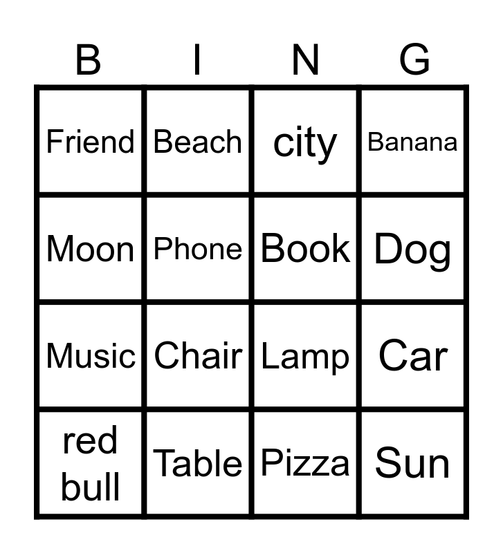 This bingo card has 16 words: Table, Car, city, Friend, Music, Beach, Lamp, Pizza, Moon, Phone, red bull, Banana, Chair, Dog, Book and Sun.