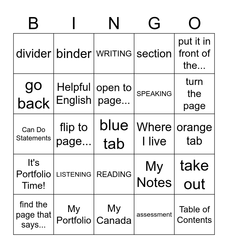 This bingo card has 29 words: find the page that says..., inventory page, flip to page..., Table of Contents, divider, WRITING, Helpful English, LISTENING, Where I live, My Portfolio, orange tab, blue tab, My Canada, assessment, turn the page, Language Companion Binder, READING, It's Portfolio Time!, put it in front of the..., Can Do Statements, My Notes, We're almost done!, SPEAKING, go back, section, binder, take out, open to page... and go forward.