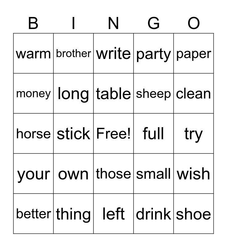 This bingo card has a free space and 31 words: left, first, stick, fast, warm, write, long, small, full, drink, try, shoe, far, wash, clean, draw, wish, own, your, those, paper, laugh, better, brother, sheep, money, party, horse, thing, table and found.