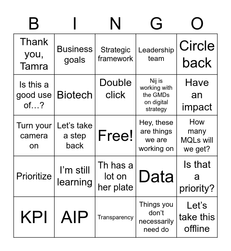This bingo card has a free space and 24 words: I’m still learning, AIP, Double click, KPI, Circle back, Thank you, Tamra, Is this a good use of…?, Business goals, Hey, these are things we are working on, Th has a lot on her plate, Nij is working with the GMDs on digital strategy, Turn your camera on, Data, Is that a priority?, Biotech, Things you don’t necessarily need do, How many MQLs will we get?, Strategic framework, Have an impact, Let’s take a step back, Let’s take this offline, Prioritize, Leadership team and Transparency.