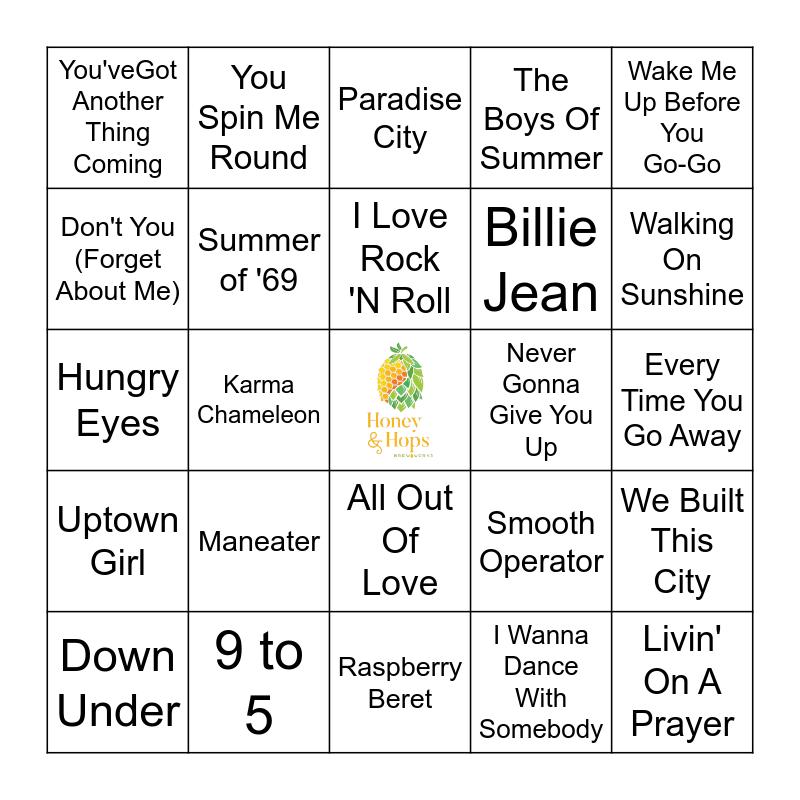 This bingo card has a free space and 34 words: Don't Stop Believin', I Wanna Dance With Somebody, Total Eclipse of the Heart, Girls Just Want To Have Fun, Uptown Girl, Summer of '69, Wake Me Up Before You Go-Go, Down Under, You Spin Me Round, Love Shack, I Love Rock 'N Roll, Paradise City, Walk This Way, Can't Fight This Feeling, Never Gonna Give You Up, Walking On Sunshine, 9 to 5, Hungry Eyes, Maneater, Smooth Operator, All Out Of Love, Eye of the Tiger, You'veGot Another Thing Coming, Every Time You Go Away, Raspberry Beret, Livin' On A Prayer, The Boys Of Summer, Every Breath You Take, Billie Jean, Don't You (Forget About Me), Black Velvet, Karma Chameleon, We Built This City and Africa.