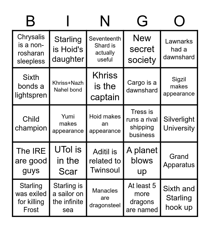 This bingo card has a free space and 24 words: UTol is in the Scar, Starling is a sailor on the infinite sea, Khriss is the captain, Starling was exiled for killing Frost, Lawnarks had a dawnshard, Chrysalis is a non-rosharan sleepless, Sixth bonds a lightspren, Starling is Hoid's daughter, Tress is runs a rival shipping business, Aditil is related to Twinsoul, Cargo is a dawnshard, Child champion, A planet blows up, Grand Apparatus, Khriss+Nazh Nahel bond, At least 5 more dragons are named, Silverlight University, Seventeenth Shard is actually useful, Sigzil makes appearance, Yumi makes appearance, Sixth and Starling hook up, The IRE are good guys, New secret society and Manacles are dragonsteel.