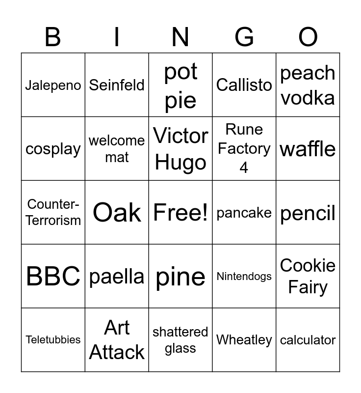 This bingo card has a free space and 24 words: paella, Art Attack, Victor Hugo, Teletubbies, peach vodka, Jalepeno, cosplay, Seinfeld, pancake, pine, Rune Factory 4, Counter-Terrorism, Nintendogs, Cookie Fairy, welcome mat, Wheatley, pencil, pot pie, waffle, Oak, calculator, BBC, Callisto and shattered glass.