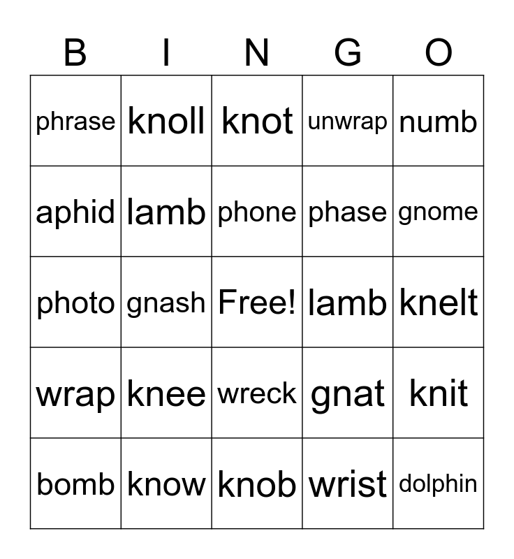 This bingo card has a free space and 29 words: morph, know, knot, graph, numb, phrase, lamb, phone, lamb, knit, bomb, gnash, wrist, dolphin, photo, wrench, knob, gnat, gnome, wrap, knee, comb, phase, knelt, aphid, knoll, wreck, unwrap and limb.