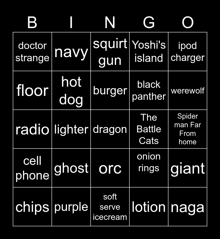 This bingo card has a free space and 24 words: ghost, purple, burger, chips, ipod charger, doctor strange, floor, navy, The Battle Cats, orc, black panther, radio, onion rings, giant, hot dog, lotion, Spider man Far From home, squirt gun, werewolf, lighter, naga, cell phone, Yoshi's island and soft serve icecream.