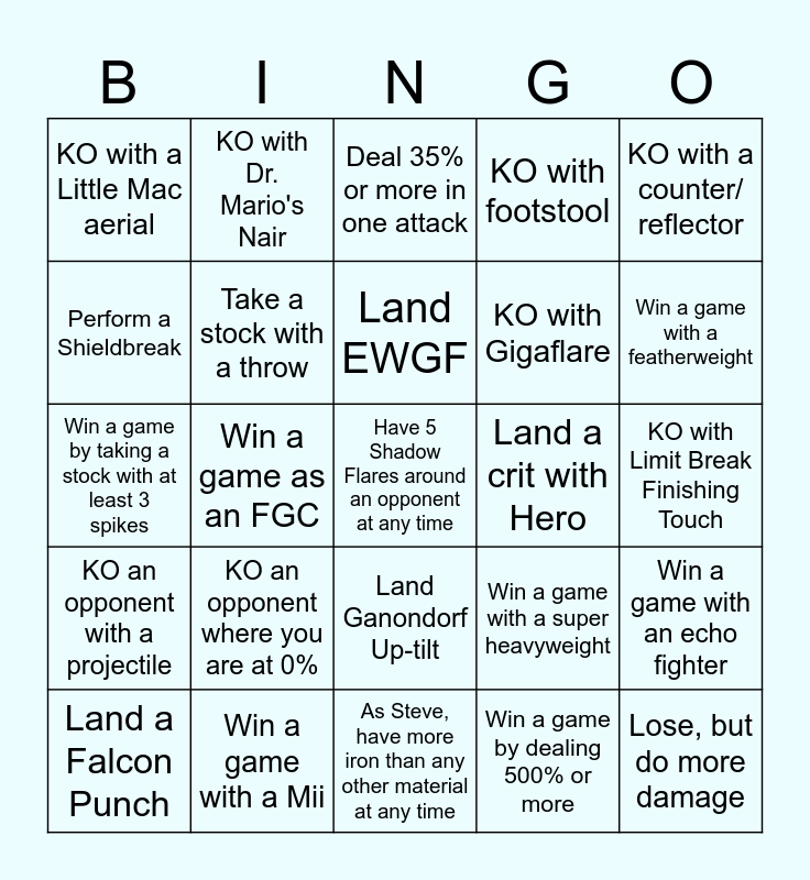This bingo card has 35 words: KO with Power Geyser, KO with Byleth Down-Smash, Be at 200% or more at any time, Take a stock with a throw, Land Ganondorf Up-tilt, KO with footstool, Perform a Shieldbreak, Win a game by dealing 300% or less, Land EWGF, KO with DK Giant Punch, Win a game by taking a stock with at least 3 spikes, KO with a counter/ reflector, Win a game with a Zelda character, Land a Judge 9 with G&W, KO with a Little Mac aerial, Land a crit with Hero, Win a game by dealing 500% or more, Win a game as an FGC, KO an opponent with a projectile, Have 5 Shadow Flares around an opponent at any time, Win a game with a super heavyweight, Land a Falcon Punch, Win a game with an echo fighter, Win a game with a Mii, Deal 35% or more in one attack, Win a game with a featherweight, Lose, but do more damage, Win a game as a Fire Emblem character, KO with Gigaflare, KO with Limit Break Finishing Touch, KO with Thwack or Whack, As Steve, have more iron than any other material at any time, KO an opponent where you are at 0%, KO with Dr. Mario's Nair and KO with a Robin Smash attack with the Bronze Sword.