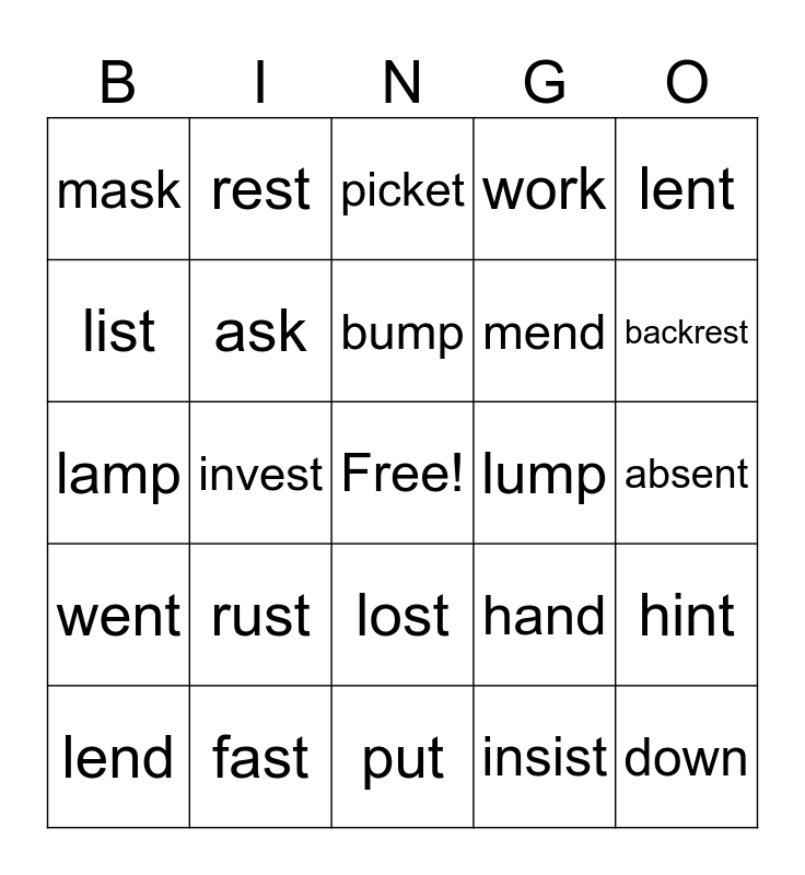 This bingo card has a free space and 24 words: rust, fast, bump, lend, lent, mask, list, rest, lump, lost, mend, lamp, hand, hint, ask, insist, absent, picket, backrest, invest, down, went, work and put.