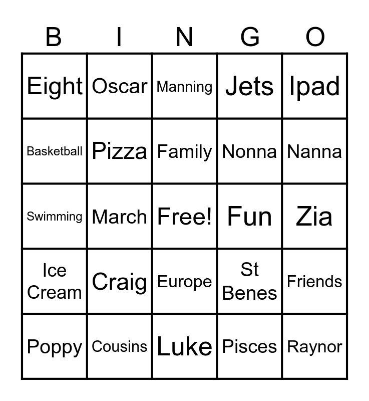 This bingo card has a free space and 47 words: Isla, Raynor, Renee, Luke, Craig, Vanessa, Oscar, Camping, Basketball, Blue, Pizza, Jets, Friends, St Benes, Blonde, Grey Eyes, Family, Fun, Roblox, Ipad, March, Pisces, Eight, Nonna, Opa, Nanna, Poppy, Pop, Europe, Ice Cream, Singapore, Hawaii, Hong Kong, Queensland, Monkey Mia, Cousins, Zia, Zio, Boba, Shopping, Jewellery, Manning, Swimming, Sunset, Eagles, Holidays and Epicurean.