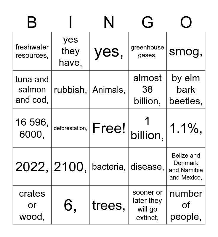 This bingo card has a free space and 40 words: TrashOut,, 16 596, 6000,, Balkan,, rubbish,, 6,, bacteria,, Animals,, large,, smog,, 2022,, deforestation,, greenhouse gases,, number of people,, 1.1%,, 1 billion,, 2100,, education,, freshwater resources,, legal,, yes,, Belize and Denmark and Namibia and Mexico,, sooner or later they will go extinct,, almost 38 billion,, tuna and salmon and cod,, fast fashion,, obviously not because there’s no sea,, cane toad,, not native,, enviroment/economy/human health,, human activities,, in ballast water,, crates or wood,, natural predators,, disease,, by elm bark beetles,, trees,, no they have not been,, no they don’t,, yes they have, and yes there is.