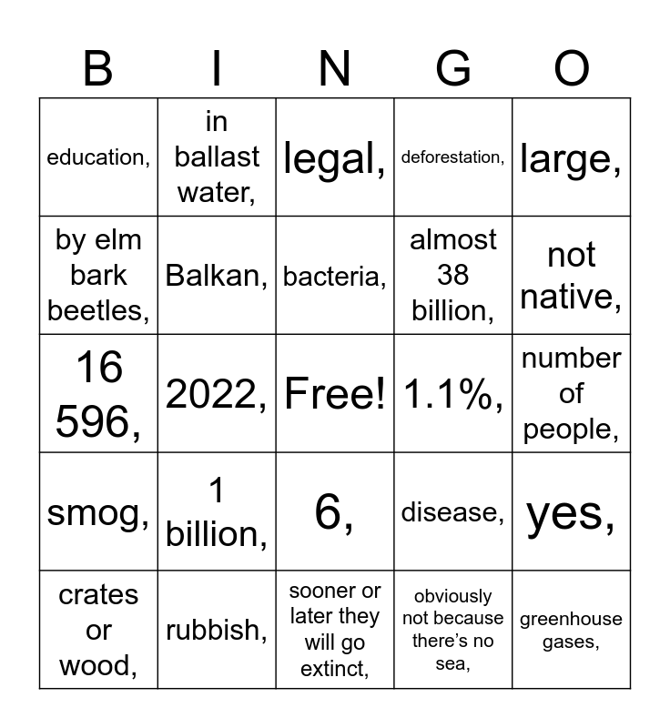 This bingo card has a free space and 41 words: TrashOut,, 16 596,, 6000,, Balkan,, rubbish,, 6,, bacteria,, Animals,, large,, smog,, 2022,, deforestation,, greenhouse gases,, number of people,, 1.1%,, 1 billion,, 2100,, education,, freshwater resources,, legal,, yes,, Belize and Denmark and Namibia and Mexico,, sooner or later they will go extinct,, almost 38 billion,, tuna and salmon and cod,, fast fashion,, obviously not because there’s no sea,, cane toad,, not native,, enviroment/economy/human health,, human activities,, in ballast water,, crates or wood,, natural predators,, disease,, by elm bark beetles,, trees,, no they have not been,, no they don’t,, yes they have, and yes there is.