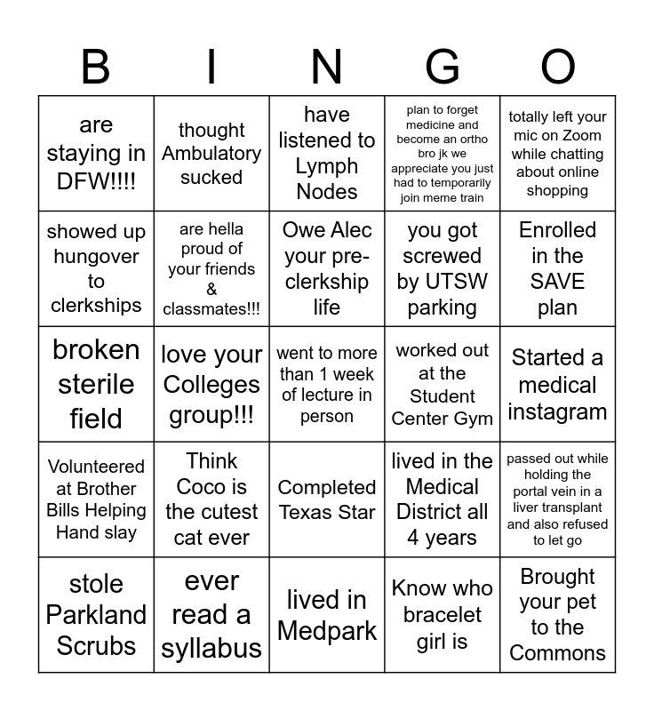 This bingo card has a free space and 32 words: Got into a fight with Chris Faulkner, ever read a syllabus, Owe Alec your pre-clerkship life, Are a significant other who actually makes money, Enrolled in the SAVE plan, are staying in DFW!!!!, love your Colleges group!!!, lived in Medpark, plan to forget medicine and become an ortho bro jk we appreciate you just had to temporarily join meme train, Brought your pet to the Commons, showed up hungover to clerkships, thought Ambulatory sucked, would vote for Michaely to be President, are "resilient", Volunteered at Brother Bills Helping Hand slay, escaped medical school without insomnia or a caffeine addiction, Completed Texas Star, lived in the Medical District all 4 years, Started a medical instagram, stole Parkland Scrubs, Think Coco is the cutest cat ever, are going to the boat party <3, Know who bracelet girl is, passed out while holding the portal vein in a liver transplant and also refused to let go, broken sterile field, are hella proud of your friends & classmates!!!, have listened to Lymph Nodes, you got screwed by UTSW parking, totally left your mic on Zoom while chatting about online shopping, bought a prom ticket and were burned, held hostage by IM conference lunch lady and worked out at the Student Center Gym.