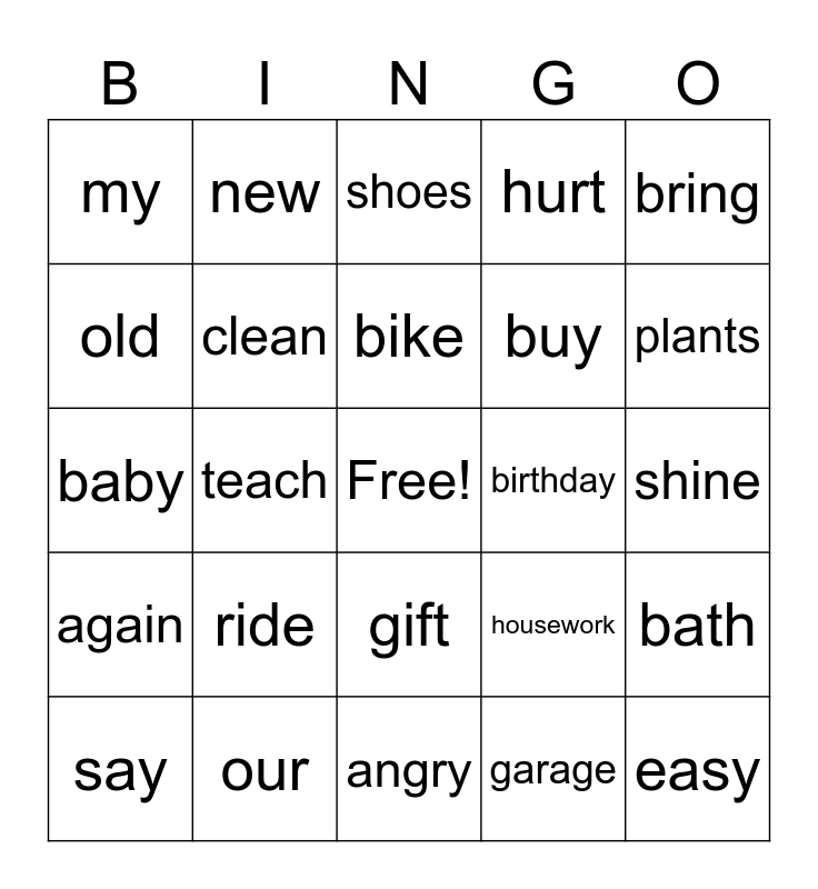 This bingo card has a free space and 24 words: ride, our, bike, say, bring, my, old, new, birthday, gift, buy, baby, housework, bath, clean, garage, shine, shoes, plants, teach, easy, again, hurt and angry.