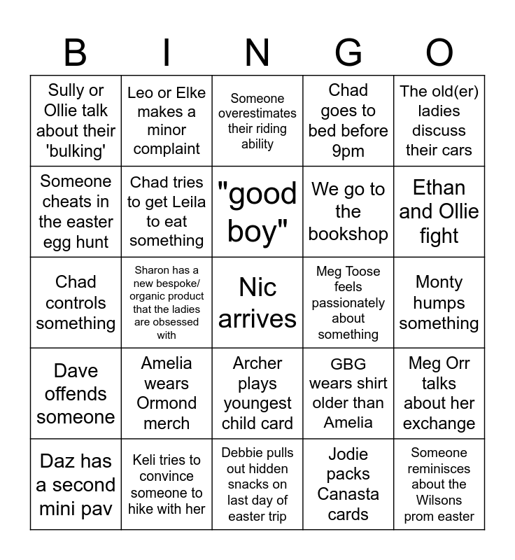This bingo card has 25 words: Amelia wears Ormond merch, Debbie pulls out hidden snacks on last day of easter trip, "good boy", Daz has a second mini pav, The old(er) ladies discuss their cars, Sully or Ollie talk about their 'bulking', Someone cheats in the easter egg hunt, Leo or Elke makes a minor complaint, Meg Toose feels passionately about something, Archer plays youngest child card, We go to the bookshop, Chad controls something, GBG wears shirt older than Amelia, Meg Orr talks about her exchange, Chad tries to get Leila to eat something, Someone reminisces about the Wilsons prom easter, Monty humps something, Someone overestimates their riding ability, Ethan and Ollie fight, Sharon has a new bespoke/ organic product that the ladies are obsessed with, Nic arrives, Keli tries to convince someone to hike with her, Dave offends someone, Chad goes to bed before 9pm and Jodie packs Canasta cards.