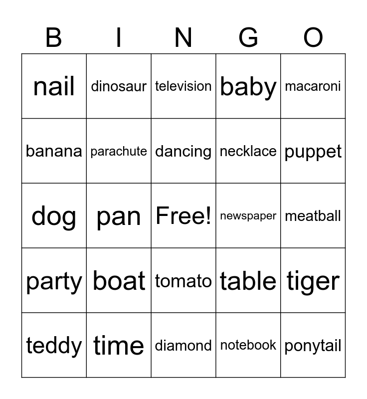 This bingo card has a free space and 35 words: ballerina, binocular, marshmallow, parachute, tomato, baby, banana, bird, dancing, dinner, dog, macaroni, mask, motorbike, nail, newspaper, notebook, pan, party, ponytail, table, teddy, tiger, time, television, puppet, pig, noodle, necklace, meatball, magic, diamond, boat, dinosaur and backpack.