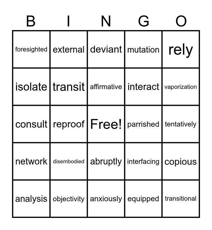 This bingo card has a free space and 34 words: anticipate, equipped, install, limited, network, transit, rely, analysis, external, virtual, affirmative, deviant, pose, registered, parrished, vaporization, objectivity, consult, disembodied, interfacing, abruptly, domesticated, foresighted, tentatively, anxiously, transitional, mutation, quarantine, interact, isolate, hermetically, reproof, copious and modify.