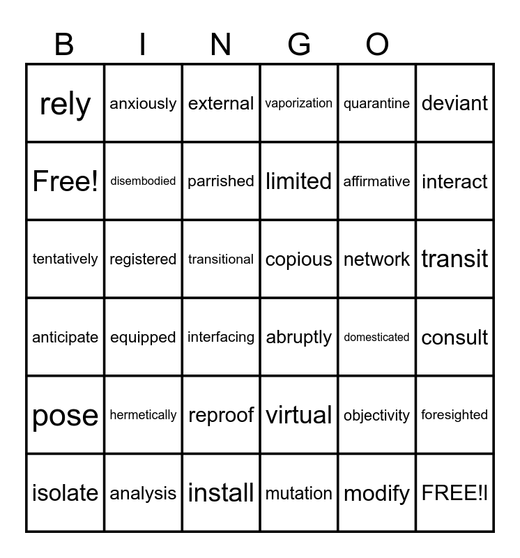 This bingo card has 36 words: anticipate, equipped, install, limited, network, transit, rely, analysis, external, virtual, affirmative, deviant, pose, registered, parrished, vaporization, objectivity, consult, Free!, disembodied, interfacing, abruptly, domesticated, foresighted, tentatively, anxiously, transitional, mutation, quarantine, interact, isolate, hermetically, reproof, copious, modify and FREE!l.