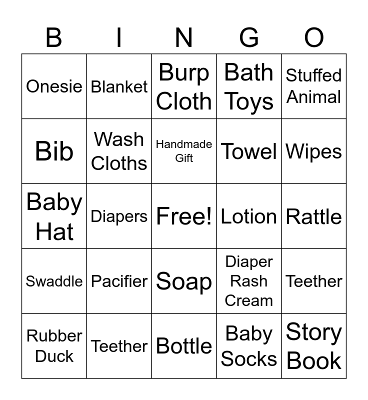 This bingo card has a free space and 25 words: Pacifier, Bottle, Handmade Gift, Rubber Duck, Stuffed Animal, Onesie, Bib, Blanket, Lotion, Soap, Towel, Baby Hat, Diaper Rash Cream, Teether, Wash Cloths, Baby Powder, Rattle, Burp Cloth, Wipes, Diapers, Story Book, Teether, Swaddle, Bath Toys and Baby Socks.