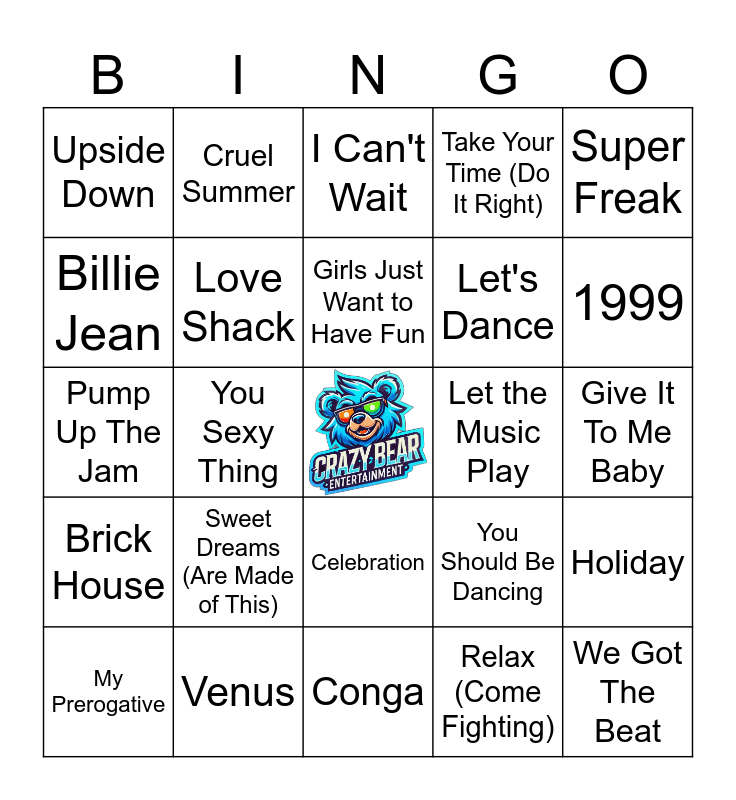 This bingo card has a free space and 78 words: Footloose, Bust A Move, I Can't Wait, Girl You Know It's True, No Parking (On the Dance Floor), Walking On Sunshine, We Don't Have To Take Our Clothes Off, Funky Cold Medina, Beat It, The Safety Dance, Word Up, Nasty, Take Your Time (Do It Right), Upside Down, She Works Hard For The Money, Billie Jean, Der Kommissar, Sweet Dreams (Are Made of This), Electric Boogie, Give It To Me Baby, Rock Steady - Radio Edit, Super Freak, Pump Up The Jam, Girls Just Want to Have Fun, Love Shack, I Wanna Dance with Somebody (Who Loves Me), All Night Long (All Night), Tell It to My Heart, I Feel for You, Walk Like an Egyptian, 1999, Flashdance...What a Feeling, Conga, Into the Groove, My Prerogative, Let the Music Play, It Takes Two, Rapture, Tainted Love, We Got The Beat, Planet Rock, Wild Thing, You Dropped A Bomb On Me, Oh Sheila, Push It, Cruel Summer, That's the Way (I Like It), Rhythm Of The Night, Get Down Tonight, Let's Hear It for the Boy, Holiday, You Sexy Thing, You Should Be Dancing, Ring My Bell, Kiss, Play That Funky Music, Gonna Make You Sweat (Everybody Dance Now), She Drives Me Crazy, My Lovin' (You're Never Gonna Get It), Celebration, Let's Dance, Faith, Groove Is in the Heart, We Are Family, Good Vibrations, Don't You Want Me, Don't Stop 'Til You Get Enough, Sussudio, Brick House, Venus, Wishing Well, Wanna Be Startin' Somethin', When Doves Cry, Freedom! '90, Relax (Come Fighting), Give It Up, Easy Lover and Let's Go Crazy.