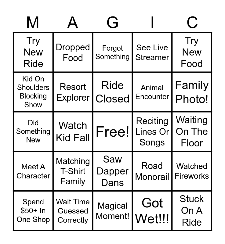 This bingo card has a free space and 24 words: Matching T-Shirt Family, Wait Time Guessed Correctly, Ride Closed, Spend $50+ In One Shop, Try New Food, Try New Ride, Kid On Shoulders Blocking Show, Dropped Food, Reciting Lines Or Songs, Saw Dapper Dans, Animal Encounter, Did Something New, Road Monorail, Watched Fireworks, Resort Explorer, Got Wet!!!, Waiting On The Floor, Forgot Something, Family Photo!, Watch Kid Fall, Stuck On A Ride, Meet A Character, See Live Streamer and Magical Moment!.