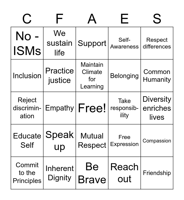 This bingo card has a free space and 34 words: Be Kind, Reach out, Under-standing, Respect differences, Educate Self, Practice justice, Respect differences, Commit to the Principles, We sustain life, Civility, Maintain Climate for Learning, Support, Eliminate bias, Be Brave, Take responsib-ility, Common Humanity, Inherent Dignity, Reject discrimin-ation, Speak up, Free Expression, Mutual Respect, Active Listening, No -ISMs, Diversity enriches lives, Be Brave, Friendship, Self-Awareness, Words Matter, Belonging, Inclusion, Equity, Empathy, Compassion and Take a stand.