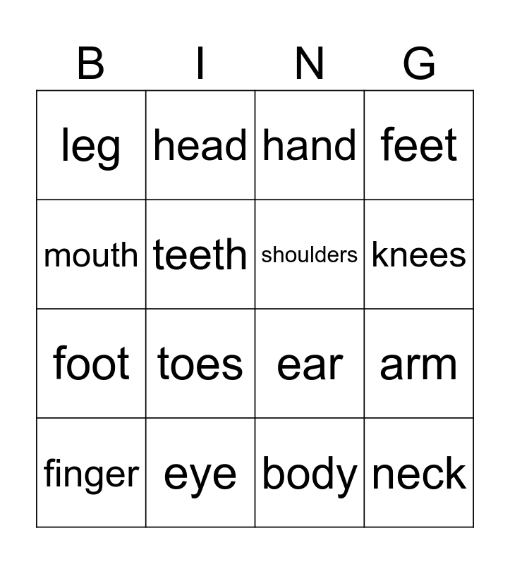 This bingo card has 16 words: eye, arm, hand, leg, foot, head, ear, body, mouth, teeth, finger, feet, toes, knees, shoulders and neck.