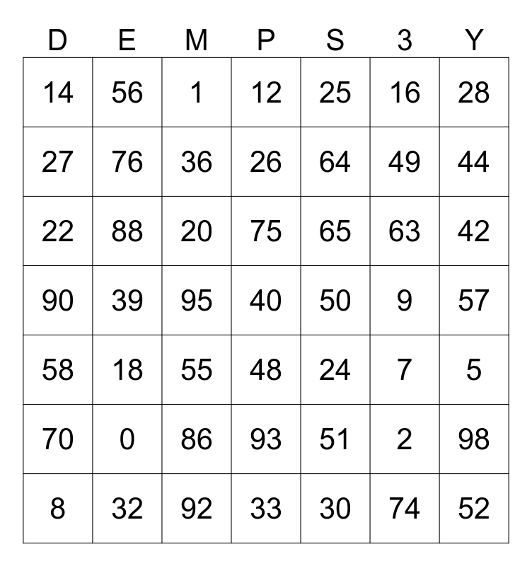 This bingo card has 80 words: Free!, 0, 1, 2, 3, 4, 5, 6, 7, 8, 9, 10, 12, 14, 15, 16, 18, 20, 21, 22, 24, 25, 26, 27, 28, 30, 32, 33, 34, 35, 36, 38, 39, 40, 42, 44, 45, 46, 48, 49, 50, 51, 52, 54, 55, 56, 57, 58, 60, 62, 63, 64, 65, 66, 68, 69, 70, 72, 74, 75, 76, 77, 78, 80, 81, 82, 84, 85, 86, 87, 88, 90, 91, 92, 93, 94, 95, 96, 98 and 100.
