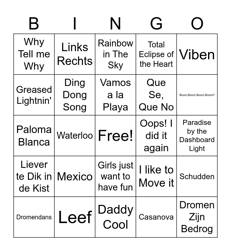 This bingo card has a free space and 45 words: Ich bin wie du, Dromen Zijn Bedrog, Ademnood, Dromendans, Dragostea Din Tei, Casanova, Rainbow in The Sky, Captain Jack, Viben, Leef, Total Eclipse of the Heart, Oops! I did it again, Girls just want to have fun, Mexico, Uptown Girl, Daddy Cool, Funkytown, Paloma Blanca, Bewegen is Gezond, Boom,Boom,Boom,Boom!!, Links Rechts, Love me just a little bit more, 99 Luftballons, Why Tell me Why, Rampeneren, Paradise by the Dashboard Light, YMCA, Macarena, I like to Move it, Liever te Dik in de Kist, Follow The Leader, Schudden, Atje voor de Sfeer, Take on Me, Anton Aus Tirol, Waterloo, Eye of the Tiger, Narcotic, La Bomba, Vamos a la Playa, Greased Lightnin', Que Se, Que No, Wake me Up before you Go-Go, Ding Dong Song and Heb je Even voor Mij.