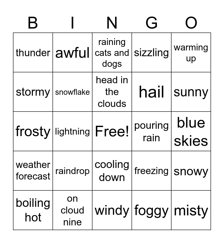 This bingo card has a free space and 24 words: raindrop, on cloud nine, head in the clouds, boiling hot, warming up, thunder, stormy, awful, pouring rain, cooling down, hail, frosty, freezing, snowy, snowflake, foggy, blue skies, raining cats and dogs, sunny, lightning, misty, weather forecast, sizzling and windy.