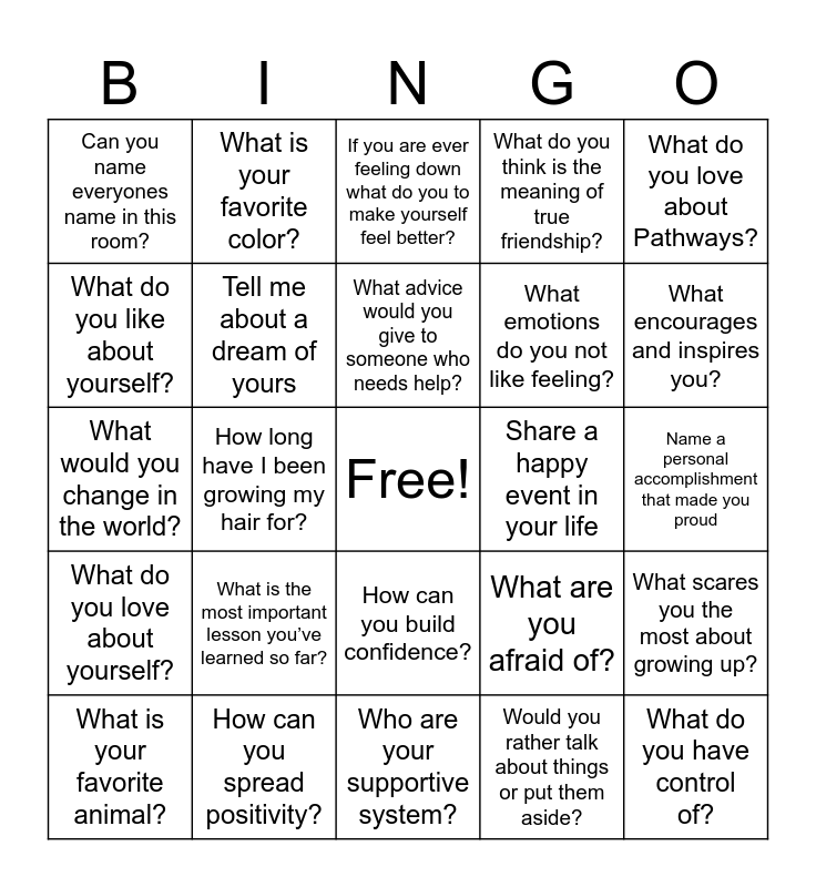 This bingo card has a free space and 24 words: What is the most important lesson you’ve learned so far?, How can you spread positivity?, What advice would you give to someone who needs help?, What is your favorite animal?, What do you love about Pathways?, Can you name everyones name in this room?, What do you like about yourself?, What is your favorite color?, Share a happy event in your life, How can you build confidence?, What emotions do you not like feeling?, What would you change in the world?, What are you afraid of?, What scares you the most about growing up?, Tell me about a dream of yours, Would you rather talk about things or put them aside?, Name a personal accomplishment that made you proud, If you are ever feeling down what do you to make yourself feel better?, What encourages and inspires you?, How long have I been growing my hair for?, What do you have control of?, What do you love about yourself?, What do you think is the meaning of true friendship? and Who are your supportive system?.