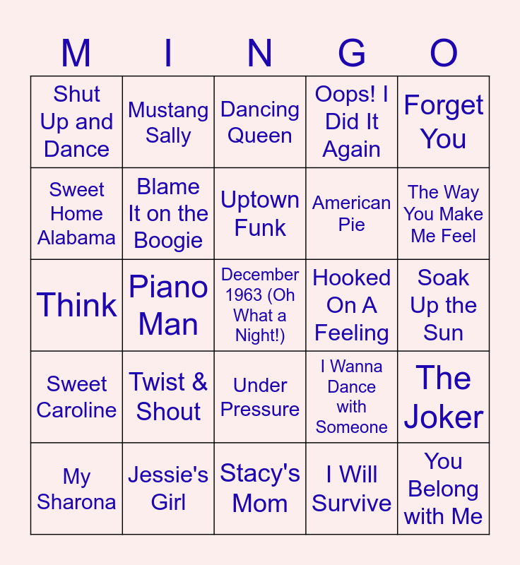 This bingo card has a free space and 34 words: Don't Go Breaking My Heart, I Will Survive, Come On Eileen, Cecilia, Sweet Caroline, Blame It on the Boogie, Forget You, My Sharona, Mustang Sally, Escape (The Pina Colada Song), Uptown Funk, Dancing Queen, Should I Stay or Should I Go, I Can't Help Myself, Hooked On A Feeling, The Way You Make Me Feel, Jessie's Girl, Think, Twist & Shout, I Wanna Dance with Someone, Under Pressure, Chicken Fried, Shut Up and Dance, Soak Up the Sun, Stacy's Mom, You Belong with Me, Oops! I Did It Again, Bye Bye Bye, American Pie, Sweet Home Alabama, September, Piano Man, The Joker and Black Water.