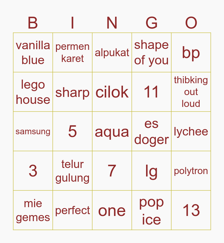 This bingo card has a free space and 24 words: mie gemes, telur gulung, cilok, pop ice, bp, vanilla blue, permen karet, alpukat, es doger, lychee, samsung, sharp, lg, polytron, lego house, perfect, one, shape of you, thibking out loud, 3, 5, 7, 11 and 13.