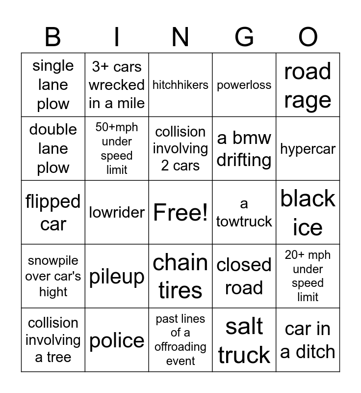This bingo card has a free space and 24 words: pileup, police, collision involving 2 cars, collision involving a tree, road rage, single lane plow, double lane plow, 3+ cars wrecked in a mile, a towtruck, chain tires, a bmw drifting, flipped car, closed road, 20+ mph under speed limit, 50+mph under speed limit, salt truck, black ice, hitchhikers, hypercar, lowrider, car in a ditch, snowpile over car's hight, powerloss and past lines of a offroading event.