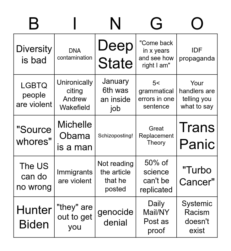 This bingo card has a free space and 24 words: Immigrants are violent, "they" are out to get you, January 6th was an inside job, Hunter Biden, IDF propaganda, Diversity is bad, LGBTQ people are violent, DNA contamination, Great Replacement Theory, Not reading the article that he posted, 5< grammatical errors in one sentence, "Source whores", 50% of science can't be replicated, "Turbo Cancer", Unironically citing Andrew Wakefield, Daily Mail/NY Post as proof, Trans Panic, Deep State, Your handlers are telling you what to say, Michelle Obama is a man, Systemic Racism doesn't exist, The US can do no wrong, "Come back in x years and see how right I am" and genocide denial.