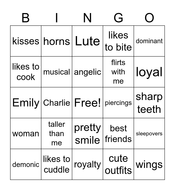 This bingo card has a free space and 24 words: taller than me, likes to cuddle, angelic, demonic, dominant, kisses, likes to cook, horns, piercings, pretty smile, flirts with me, Emily, best friends, sleepovers, musical, cute outfits, sharp teeth, Lute, loyal, Charlie, wings, woman, likes to bite and royalty.
