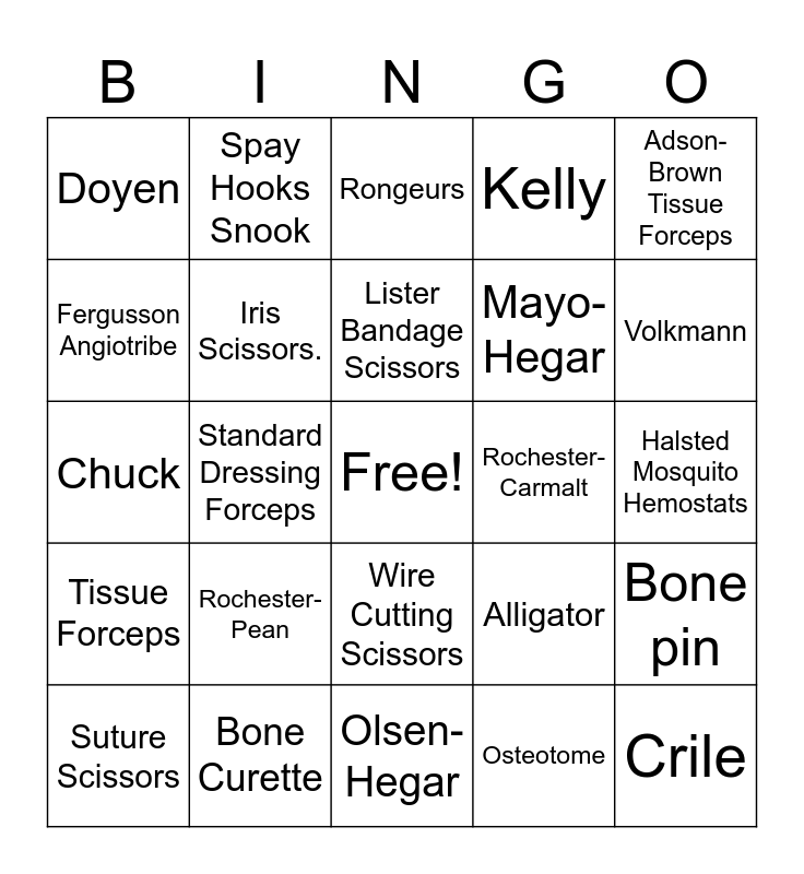 This bingo card has a free space and 39 words: Standard Operating Scissors, Metzenbaum Scissors, Mayo Dissection Scissors., Iris Scissors., Suture Scissors, Wire Cutting Scissors, Lister Bandage Scissors, Utility Scissors, Adson-Brown Tissue Forceps, Tissue Forceps, Standard Dressing Forceps, Kelly, Crile, Halsted Mosquito Hemostats, Rochester-Carmalt, Rochester-Pean, Babcock Tissue, Doyen, Allis Tissue, Alligator, Fergusson Angiotribe, Olsen-Hegar, Mayo-Hegar, Volkmann, Army-Navy, Senn, Weitlaner, Gelpi, Towel Forceps Backhaus, Spay Hooks Snook, Vaginal Speculum, Lane Bone Holding Forceps, Rongeurs, Bone Curette, Osteotome, Gigli Wire and Handles, Bone pin, Chuck and Pin Cutter.