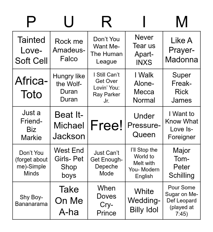 This bingo card has a free space and 30 words: Take On Me A-ha, Every Breath You Take -The Police, Beat It- Michael Jackson, Sweet Child O’ Mine- Guns and Roses, Tainted Love- Soft Cell, Don’t You Want Me- The Human League, Hungry like the Wolf- Duran Duran, Just Can’t Get Enough- Depeche Mode, Under Pressure- Queen, When Doves Cry- Prince, I Want to Know What Love Is- Foreigner, Pour Some Sugar on Me-Def Leopard (played at 7:45), White Wedding- Billy Idol, Call Me- Blondie, Super Freak- Rick James, With or Without You- U2, I’ll Stop the World to Melt with You- Modern English, Don’t You (forget about me)-Simple Minds, West End Girls- Pet Shop boys, Like A Prayer- Madonna, Just a Friend- Biz Markie, ‘99 Luftballoons- Nena, Rock me Amadeus- Falco, I Walk Alone- Mecca Normal, Africa- Toto, Never Tear us Apart- INXS, Major Tom- Peter Schilling, Shy Boy- Bananarama, I Still Can’t Get Over Lovin’ You: Ray Parker Jr. and 3Hangin’ Tough- New Kids on the Block.