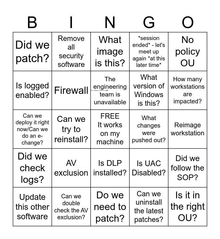 This bingo card has 3 images, a free space and 24 words: AV exclusion, Can we double check the AV exclusion?, The engineering team is unavailable, Update this other software, No policy OU, Did we patch?, Is logged enabled?, Remove all security software, What changes were pushed out?, Is DLP installed?, What version of Windows is this?, Can we deploy it right now/Can we do an e-change?, Is UAC Disabled?, Did we follow the SOP?, Firewall, Can we uninstall the latest patches?, Reimage workstation, What image is this?, How many workstations are impacted?, Can we try to reinstall?, Is it in the right OU?, Did we check logs?, *session ended* - let's meet up again *at this later time* and Do we need to patch?.