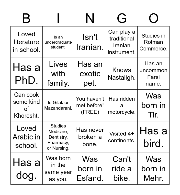 This bingo card has a free space and 24 words: Studies Medicine, Dentistry, Pharmacy, or Nursing., Was born in the same year as you., Has an exotic pet., Has a dog., Studies in Rotman Commerce., Loved literature in school., Has a PhD., Is an undergraduate student., Has ridden a motorcycle., Has never broken a bone., Knows Nastaligh., Can cook some kind of Khoresht., Visited 4+ continents., Has a bird., Lives with family., Can't ride a bike., Was born in Tir., Isn't Iranian., Has an uncommon Farsi name., Is Gilak or Mazandarani., Was born in Mehr., Loved Arabic in school., Can play a traditional Iranian instrument. and Was born in Esfand..