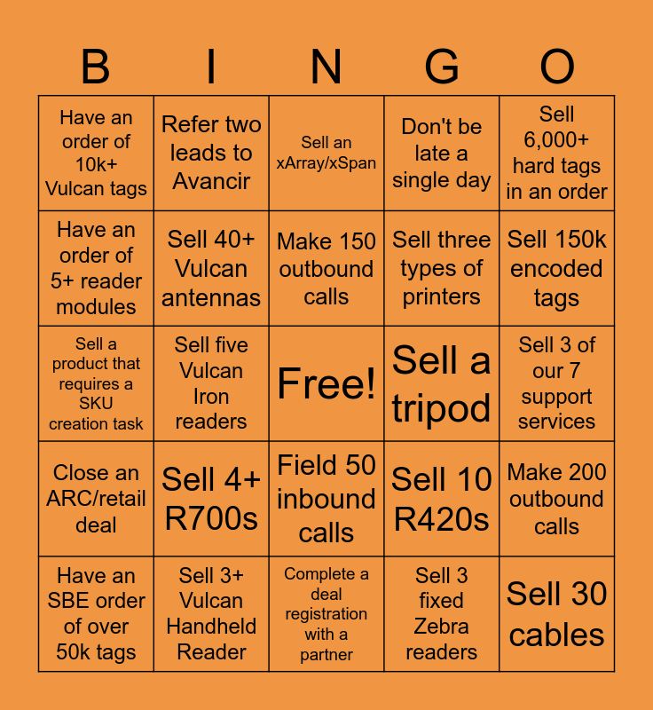 This bingo card has a free space and 24 words: Sell 4+ R700s, Sell 3+ Vulcan Handheld Reader, Make 150 outbound calls, Have an SBE order of over 50k tags, Sell 6,000+ hard tags in an order, Have an order of 10k+ Vulcan tags, Have an order of 5+ reader modules, Refer two leads to Avancir, Sell a tripod, Field 50 inbound calls, Sell three types of printers, Sell a product that requires a SKU creation task, Sell 10 R420s, Make 200 outbound calls, Sell 40+ Vulcan antennas, Sell 3 fixed Zebra readers, Sell 3 of our 7 support services, Sell an xArray/xSpan, Sell 150k encoded tags, Sell five Vulcan Iron readers, Sell 30 cables, Close an ARC/retail deal, Don't be late a single day and Complete a deal registration with a partner.