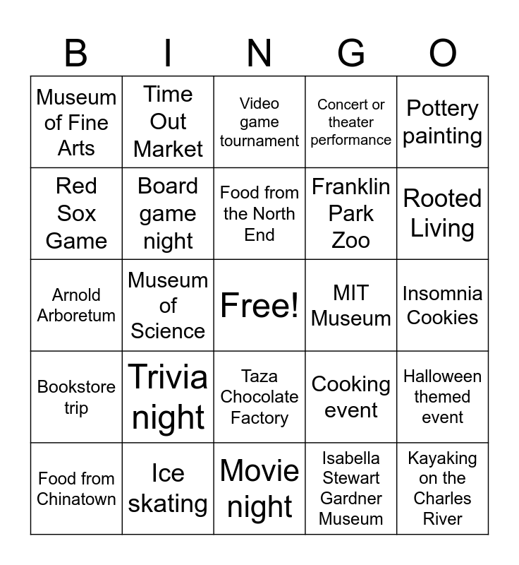 This bingo card has a free space and 24 words: Trivia night, Ice skating, Food from the North End, Food from Chinatown, Pottery painting, Museum of Fine Arts, Red Sox Game, Time Out Market, MIT Museum, Taza Chocolate Factory, Franklin Park Zoo, Arnold Arboretum, Cooking event, Halloween themed event, Board game night, Isabella Stewart Gardner Museum, Insomnia Cookies, Video game tournament, Rooted Living, Museum of Science, Kayaking on the Charles River, Bookstore trip, Concert or theater performance and Movie night.