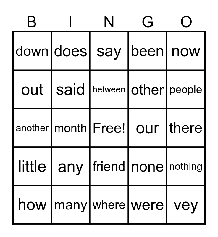 This bingo card has a free space and 24 words: any, many, between, how, now, down, out, does, our, friend, other, another, none, nothing, said, were, there, say, people, month, vey, little, been and where.