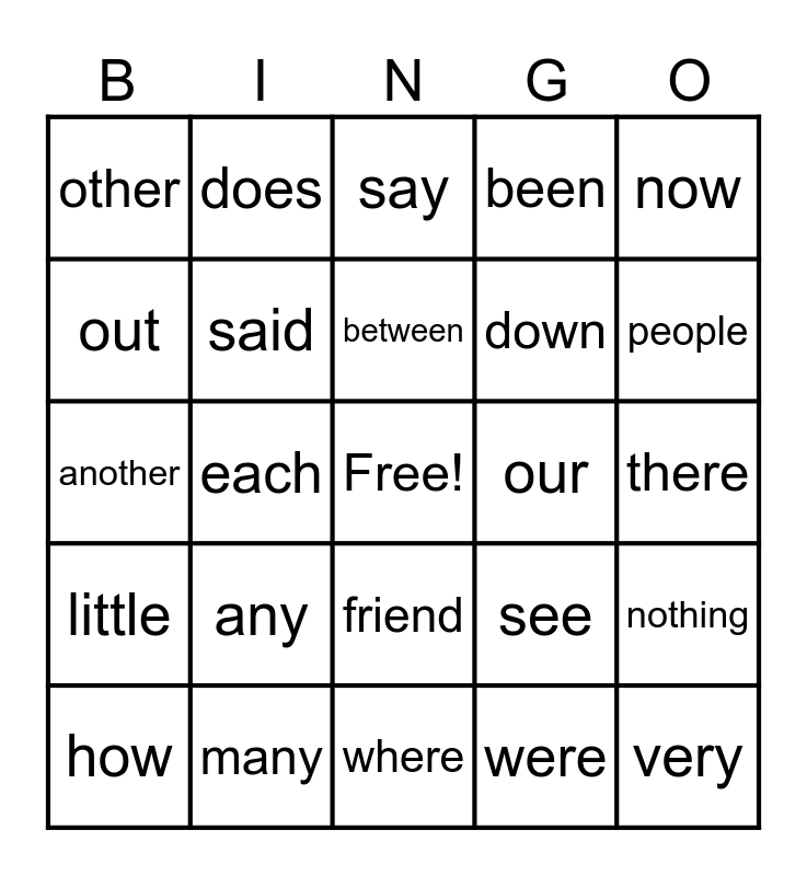 This bingo card has a free space and 24 words: any, many, between, how, now, other, out, does, our, friend, down, another, see, nothing, said, were, there, say, people, each, very, little, been and where.