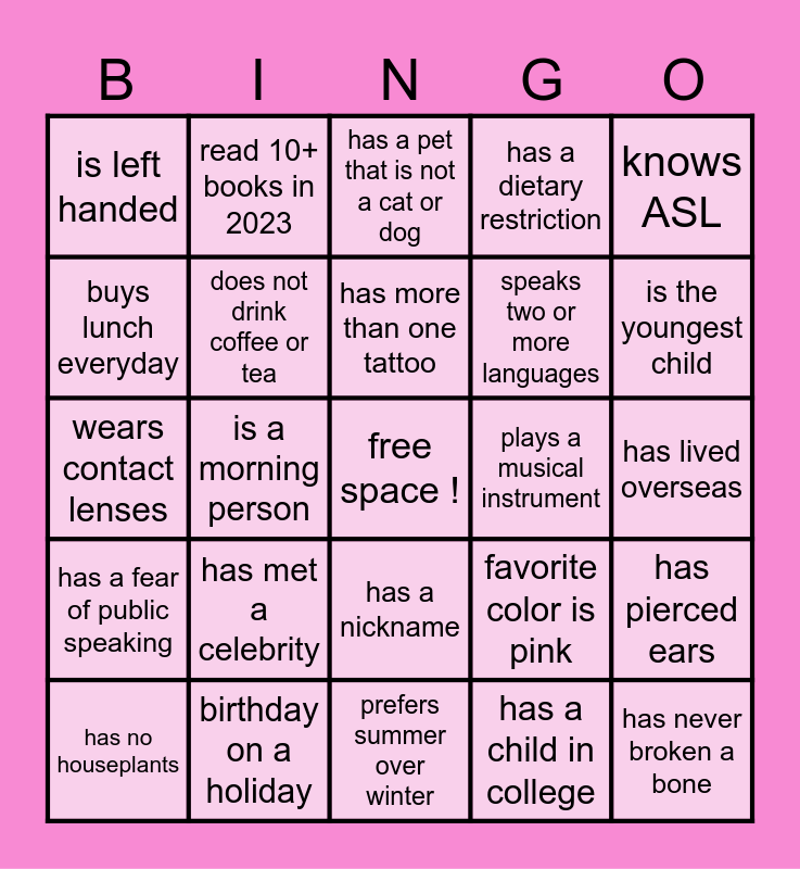 This bingo card has a free space and 24 words: has met a celebrity, birthday on a holiday, has more than one tattoo, has no houseplants, knows ASL, is left handed, buys lunch everyday, read 10+ books in 2023, plays a musical instrument, has a nickname, speaks two or more languages, wears contact lenses, favorite color is pink, has pierced ears, does not drink coffee or tea, has a child in college, has lived overseas, has a pet that is not a cat or dog, is the youngest child, is a morning person, has never broken a bone, has a fear of public speaking, has a dietary restriction and prefers summer over winter.