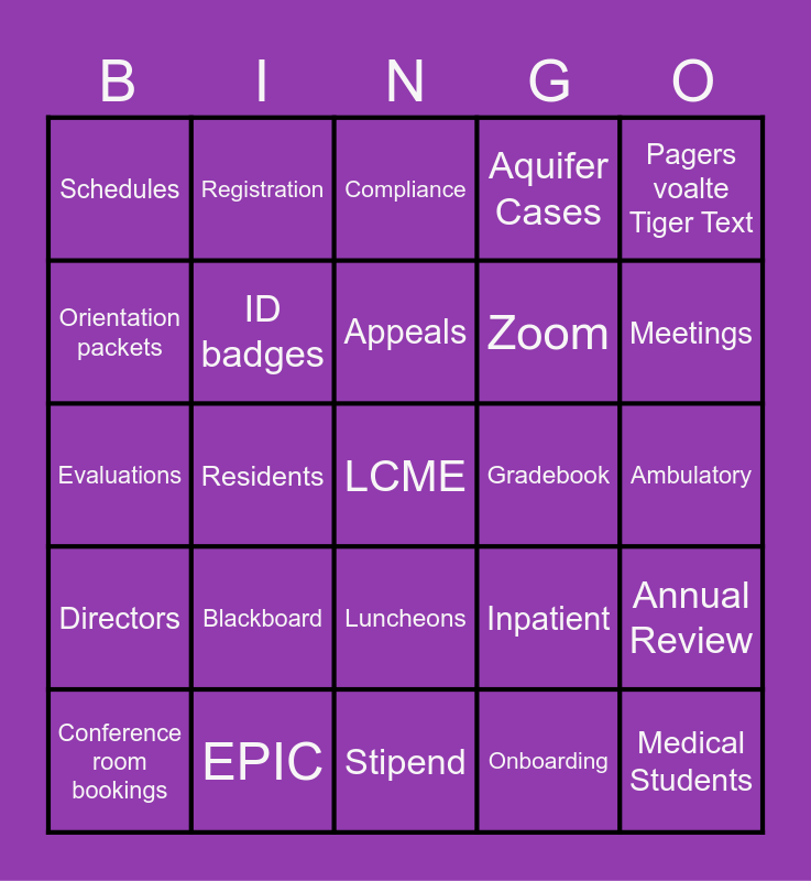 This bingo card has 30 words: Conference room bookings, Parking, Appeals, Specialty Clinics, Pagers voalte Tiger Text, Schedules, Registration, Luncheons, Gradebook, Medical Students, Directors, ID badges, COMSEP 2024, Onboarding, Annual Review, Budget, Residents, LCME, Inpatient, Meetings, Evaluations, EPIC, Compliance, Zoom, Ambulatory, Orientation packets, Blackboard, Stipend, Aquifer Cases and RCE's.