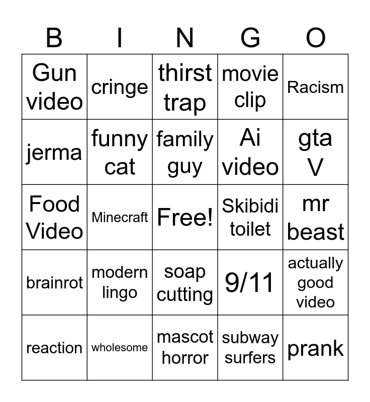 This bingo card has a free space and 24 words: modern lingo, wholesome, family guy, reaction, Racism, Gun video, jerma, cringe, Skibidi toilet, soap cutting, Ai video, Food Video, 9/11, actually good video, funny cat, subway surfers, mr beast, thirst trap, gta V, Minecraft, prank, brainrot, movie clip and mascot horror.