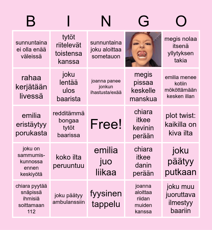 This bingo card has 1 images, a free space and 23 words: koko ilta peruuntuu, joku päätyy ambulanssiin, joanna panee jonkun ihastusta/exää, chiara pyytää snäpissä ihmisiä soittamaan 112, megis nolaa itsenä yllytyksen takia, sunnuntaina ei olla enää väleissä, rahaa kerjätään livessä, tytöt riitelevät toistensa kanssa, chiara itkee kevinin perään, emilia juo liikaa, megis pissaa keskelle manskua, emilia eristäytyy porukasta, chiara itkee danin perään, joku päätyy putkaan, joku lentää ulos baarista, joanna aloittaa riidan muiden kanssa, plot twist: kaikilla on kiva ilta, sunnuntaina joku aloittaa sometauon, emilia menee kotiin mököttämään kesken illan, redditämmä bongaa tytöt baarissa, joku muu juoruttava ilmestyy baariin, joku on sammumis-kunnossa ennen keskiyötä and fyysinen tappelu.