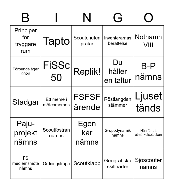 This bingo card has 26 words: Egen kår nämns, Geografiska skillnader, Replik!, Ordningsfråga, Nothamn VIII, Principer för tryggare rum, Förbundsläger 2026, Tapto, Ljuset tänds, Gruppdynamik nämns, Du håller en taltur, Stadgar, Nån får ett utmärkelsetecken, FS medlemsmöte nämns, Ett meme i mötesmemes, TG nämns, Inventerarnas berättelse, Paju-projekt nämns, Scoutchefen pratar, FSFSF ärende, B-P nämns, Scoutklapp, Röstlängden stämmer, Scoutfostran nämns, FiSSc 50 and Sjöscouter nämns.
