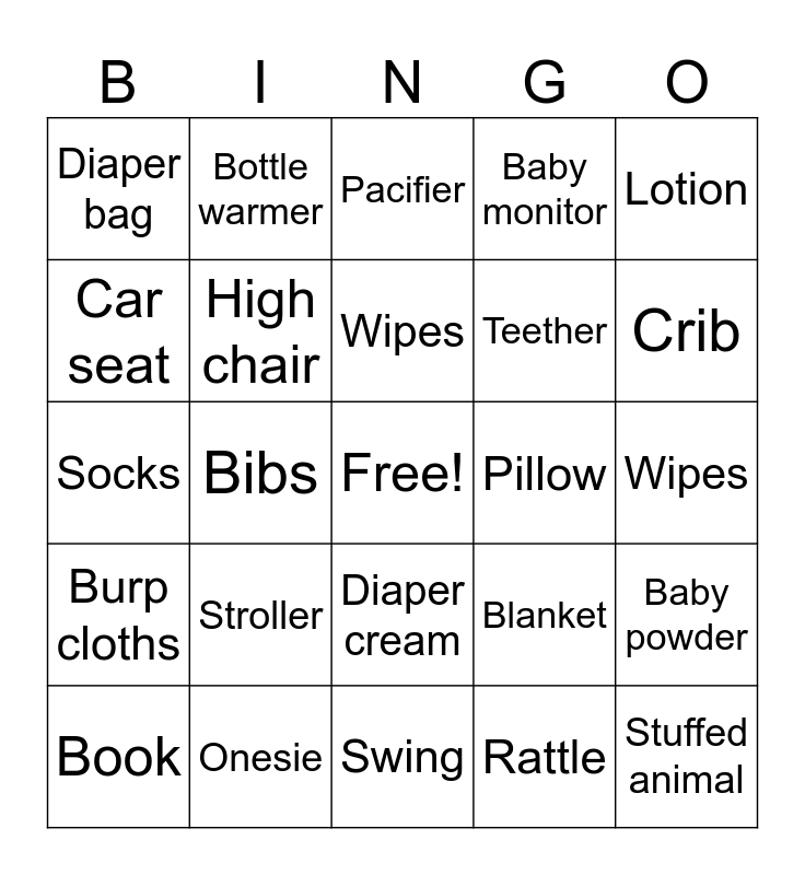 This bingo card has a free space and 24 words: Stroller, Onesie, Wipes, Book, Lotion, Diaper bag, Car seat, Bottle warmer, Pillow, Diaper cream, Teether, Socks, Blanket, Baby powder, High chair, Rattle, Wipes, Pacifier, Crib, Bibs, Stuffed animal, Burp cloths, Baby monitor and Swing.